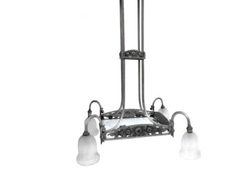 Suspension en fer forgé ajouré à décor de roses, à vasque centrale quadrangulaire…