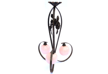 Suspension en fer forgé à décor de roses à trois enroulements soutenant des globes…