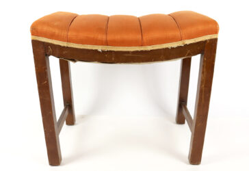Banc de piano en bois naturel, l’assise garnie de tissu orangé. Haut. : 50 cm – Larg….