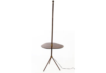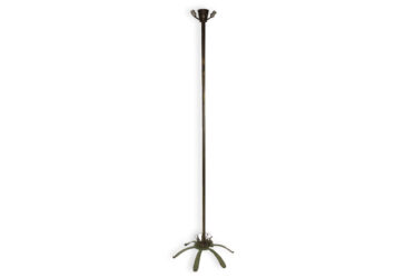 Lampadaire en métal, piètement tripode réuni par une sphère en laiton doré et surmonté…