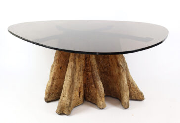 Table basse de salon à plateau en verre fumé, le pied formé d’une souche d’arbre….