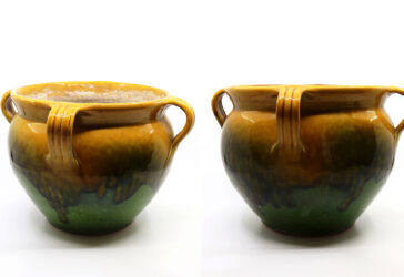 Paire de cache-pot en terre cuite émaillée ocre et vert. Haut. : 22,5 cm – Diam.