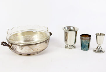 Ensemble comprenant une tasse en métal argenté à décor d’une frise de perles et une…