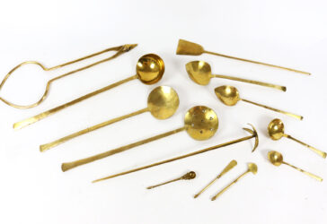 Ensemble de 13 ustensiles de cuisine en métal doré.