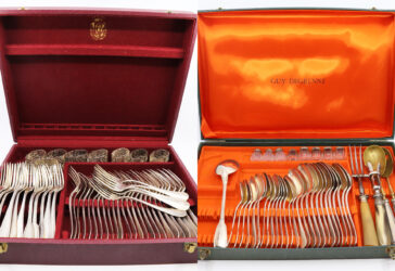 Deux couverts en métal argenté dans leur coffret. On y joint 4 couverts à dessert…