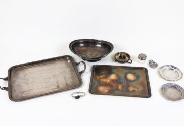 Ensemble en métal argenté comprenant deux plateaux, une coupe navette, un presse-agrumes,…