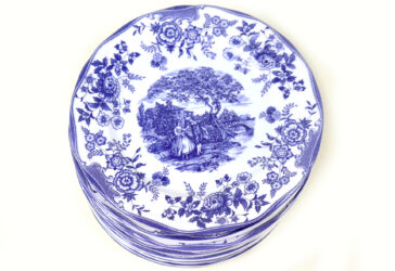 Ensemble de 12 assiettes en faïence à décor imprimé bleu de scènes galantes dans