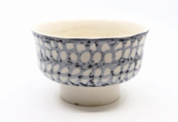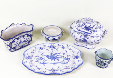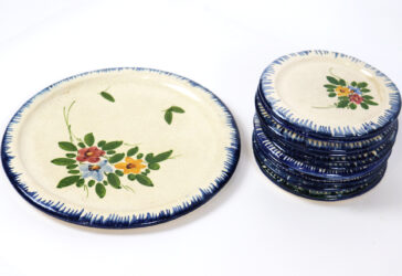 Partie de service à dessert en céramique émaillée à decor de peigné bleu sur l’aile…