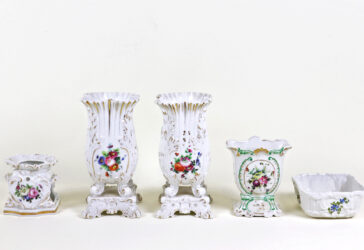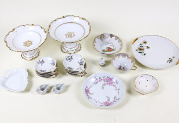 Ensemble en porcelaine comprenant notamment, deux présentoirs à mignardises, huit…