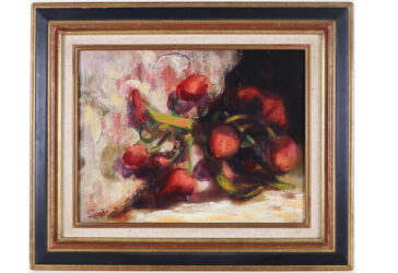SANAE (XXe) Rinceaux fleuris Email sur verre dans un encadrement de bois sculpté….