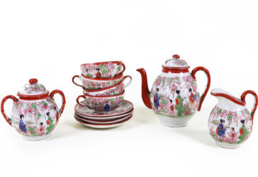 JAPON Service à thé en porcelaine à décor de femmes comprenant une théière, un sucrier,…