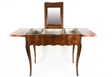Coiffeuse en bois naturel et bois de placage, ouvrant par deux tiroirs en ceinture….