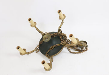 Suspension à cinq bras de lumière en tôle laquée noire et bronze doré, sommée d’une…