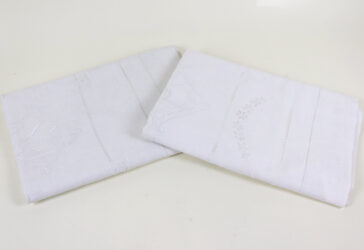 Ensemble de deux draps anciens en coton et lin blanc à décor brodé et chiffré.