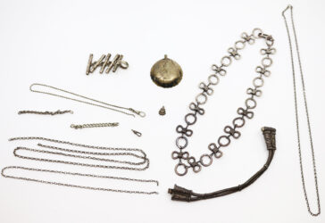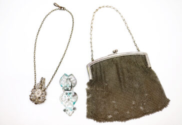 Ensemble comprenant une aumonière en métal à cotte de maille, une châtelaine en métal…