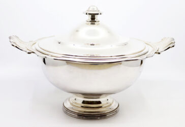 Légumier couvert sur piédouche en métal argenté, les deux anses en agrafe et les