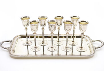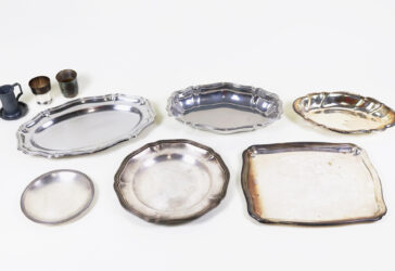 Ensemble en métal argenté comprenant deux plateaux, une coupe navette, un presse-agrumes,…