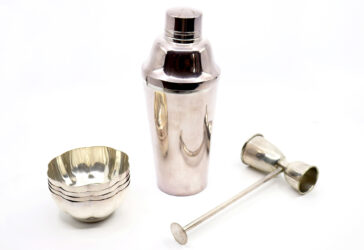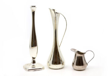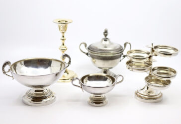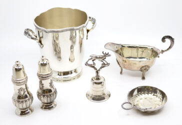 Ensemble en métal argenté comprenant un sceau à glaçons, une saucière, une clochette…