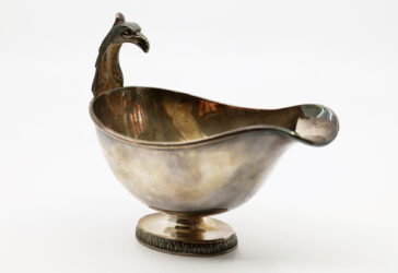 Saucière casque en métal argenté sur piédouche, l’anse en tête d’aigle, le pied à…