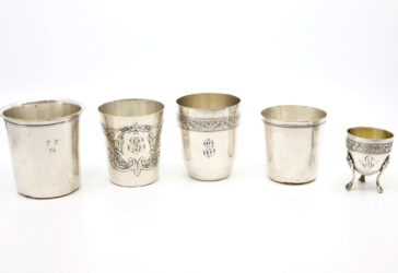 Lot de quatre timbales et un coquetier en métal argenté. (Accidents).