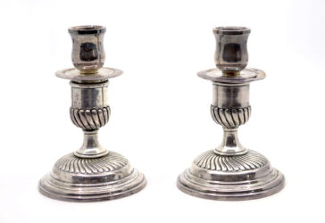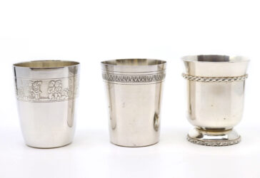 Timbale en métal argenté à décor de coquilles et filets. Chiffrée TS et datée 8.07.07….