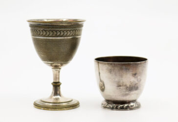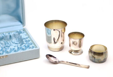 Nécessaire de baptême en métal argenté comprenant une timbale et un coquetier tulipes,…