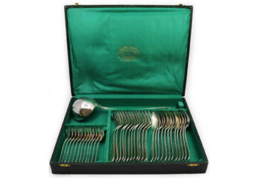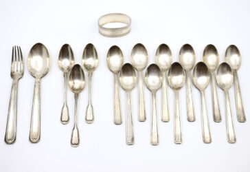 Ensemble en métal argenté comprenant : – 11 cuillères à dessert, le manche à pans…