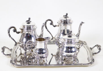 Partie de service à thé et café en métal argenté à décor d’agrafes et feuilles d’acanthe…