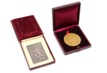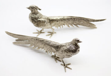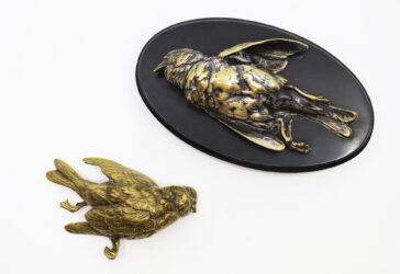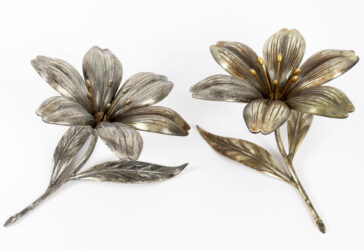 S. AGUDO PATENT Paire de cendriers en bronze argenté et doré stylisant des fleurs,…