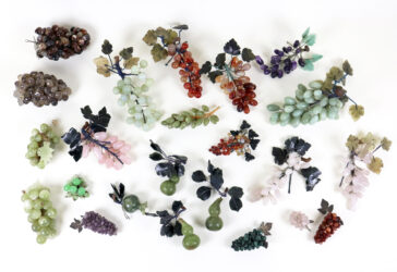 Ensemble de fruits en trompe l’œil dont grappes de raisin et calebasses.